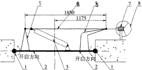1.風(fēng)門轉(zhuǎn)軸;2·門扇;3.氣缸;5·曲柄;6·連桿;7·滑輪;8.配重